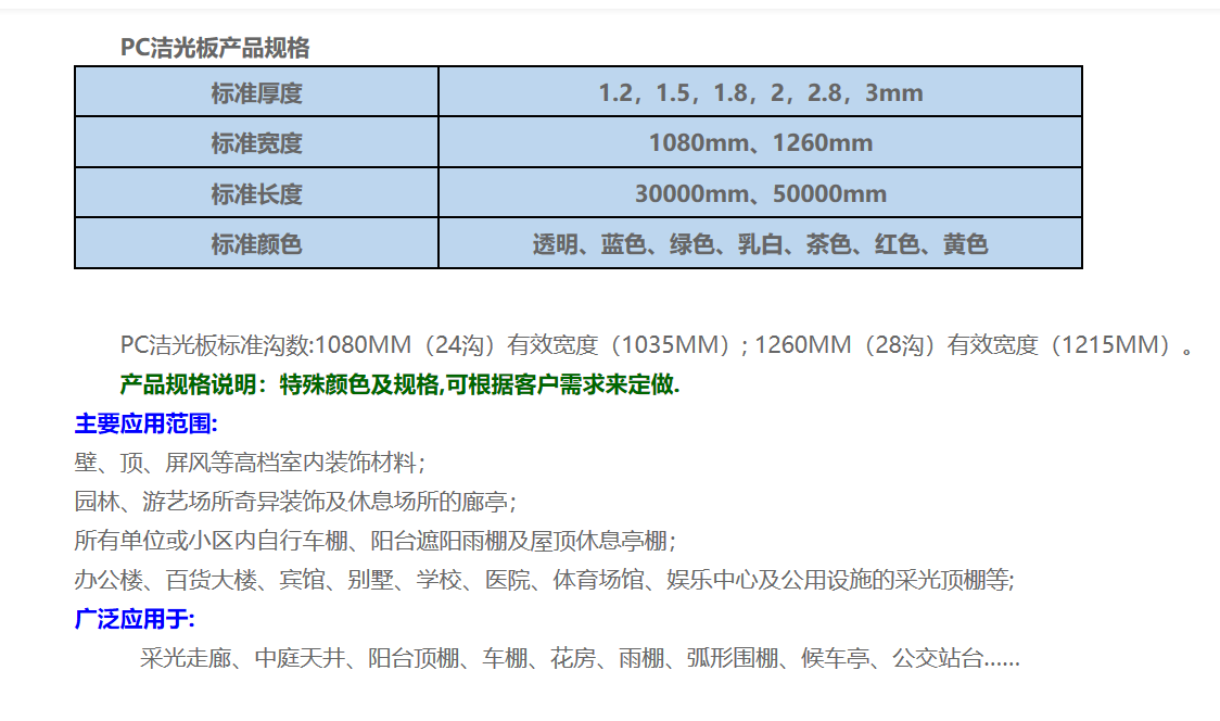 主營:PC波浪瓦、PC耐力板、PC潔光板、PC陽光板、PC雨陽蓬、PC壓條、PC配件,承接任何塑料工藝成型深加工,昊塑板材具有:抗紫外線、耐老化、抗沖擊、隔音、隔熱、難燃等優異性能,成為樓頂采光、高速公路隔音、燈箱廣告、候車廳、家居陽臺等的不錯之選。